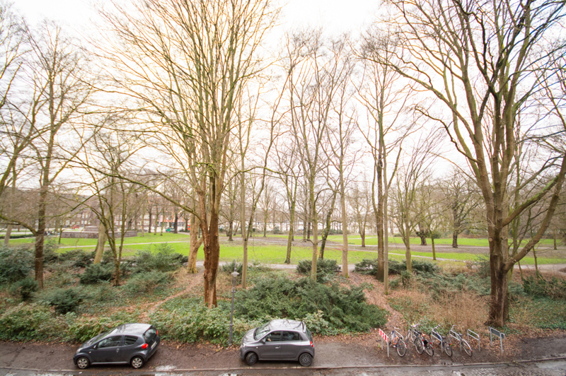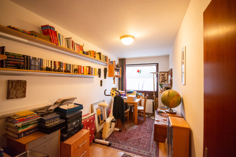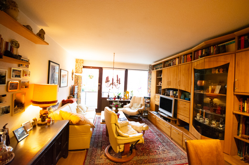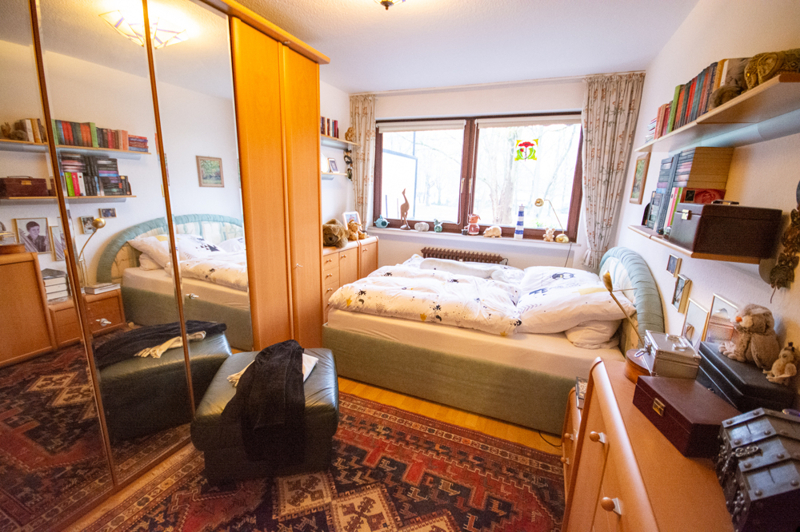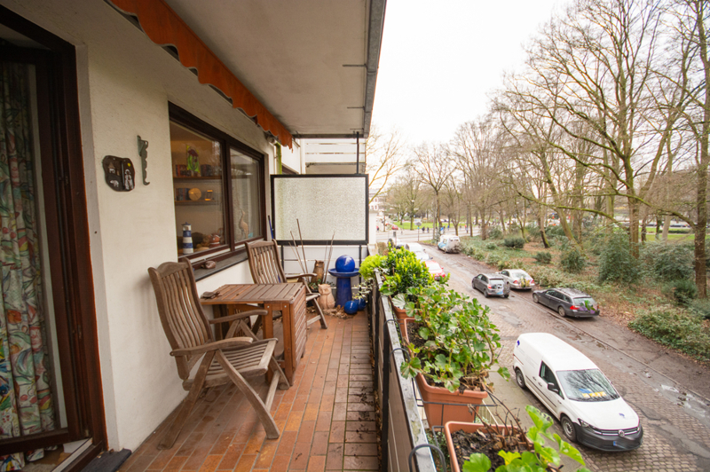 Vom Wohn-Esszimmer aus erreichen Sie den geräumigen Balkon, der Ihnen einen schönen Blick in den gegenüberliegenden Park bietet. Die Küche ist mit einer gepflegten Einbauküche ausgestattet. Im großen Schlafzimmer findet sich Platz für einen Kleiderschrank und ein Doppelbett.