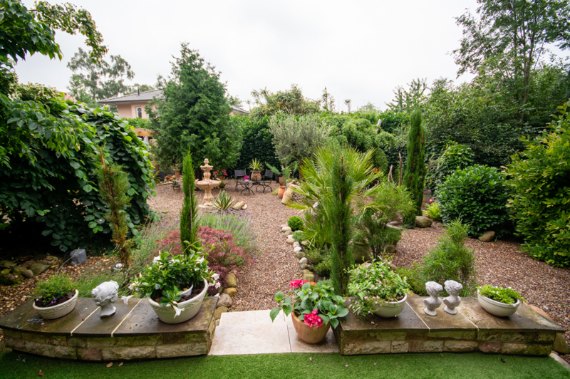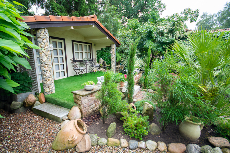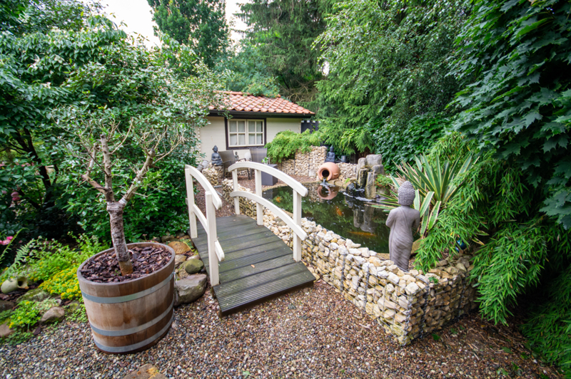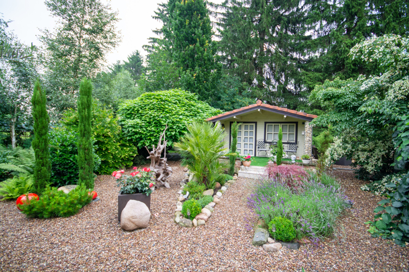 Der Garten ist mit viel Liebe zum Detail hergerichtet. Es erwartet Sie ein Garten mit Kieslandschaft, tollen Wegen aus Naturstein und sehenswert bepflanzten Beeten sowie einem Koiteich. Außerdem bietet ein ca. 20 qm großes Gartenhaus nützlichen Stauraum für Gartengeräte, Fahrräder, etc..